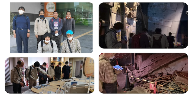 災害現場の再現は結構リアルで少し恐怖感も感じられましたが利用者の皆さんは臆する様子もなく問題を解いていきました。一時避難場所に設定された公園(実際は室内の1室)では大きなスクリーンから問題を出題され、解答用に色分けされたカーペットに移動して答えるといったクイズ番組のような演出がありました。